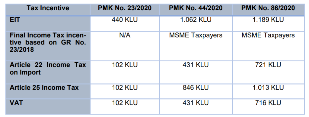 Previously, the government issued a number of tax incentives such as the Article 21 Employee Income Tax (“EIT”), Article 22 Import Tax, a 30% reduction in installments of Article 25 Income Tax, ease of acceleration of Value Added Tax (“VAT”), as well as the restitution and final income tax under the Government Regulation No. 23 of 2018 ("GR No. 23/2018") for micro, small and medium enterprises (“MSME”). The following changes are the additional framework for the granting of tax incentives that have now been enacted under PMK No. 86/2020: