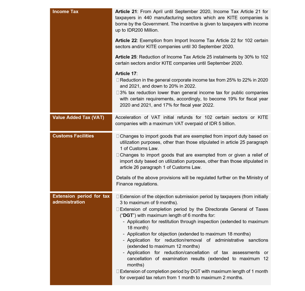 For individual taxpayers, incentive to Income Tax Article 21 is intended to maintain purchasing power of the low to medium income employee during the COVID-19. While, the Income Tax Article 21 will be fully borne by the Government, the employer shall pay the relevant employees’ salary in full amount without tax deduction. In addition, for employers to obtain the incentive, they shall submit a notification for the application of incentive for Income Tax Article 21 to the relevant Tax Office. As for businesses, in particular companies from 440 manufacturing sectors, 102 certain sectors and companies that have been registered and are entitled to Ease of Importing for Export Purposes facility (Kemudahan Impor Tujuan Ekspor “KITE”), the fiscal stimulus is intended to maintain taxpayers’ cash flow by providing leniency in income tax as well as acceleration of VAT refund, in addition to also provide ease in doing business during the pandemic of COVID-19.