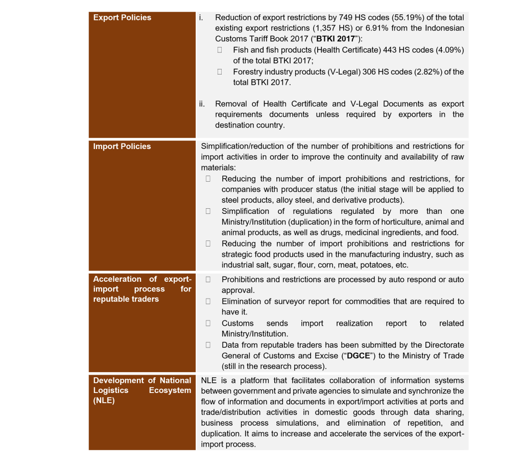 This non-fiscal stimulus is expected to maintain domestic supply of products, as well as to take the opportunity from the weakening of Indonesian Rupiah for the export activity. Leniency in import policy is expected to encourage importers to keep on supplying products to Indonesia, in particular, basic necessities (e.g. food), to ensure the continuation of availability during COVID-19. During this critical condition, simplification of export-import mechanism through the NLE, a platform that integrates the Government and private agencies, is crucial as it will be expected to accelerate the flow of products as well as reduce the logistics cost for both exporters and importers.