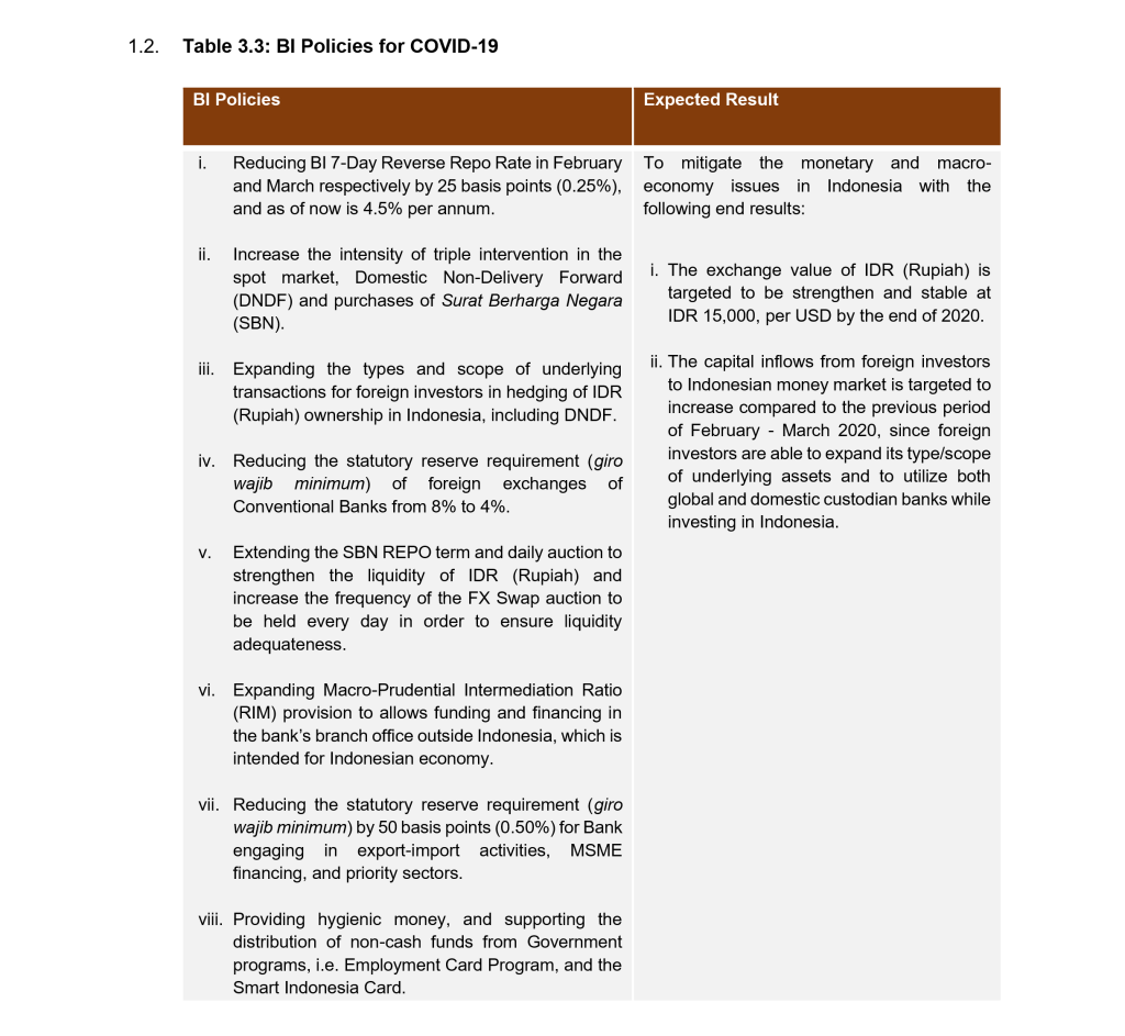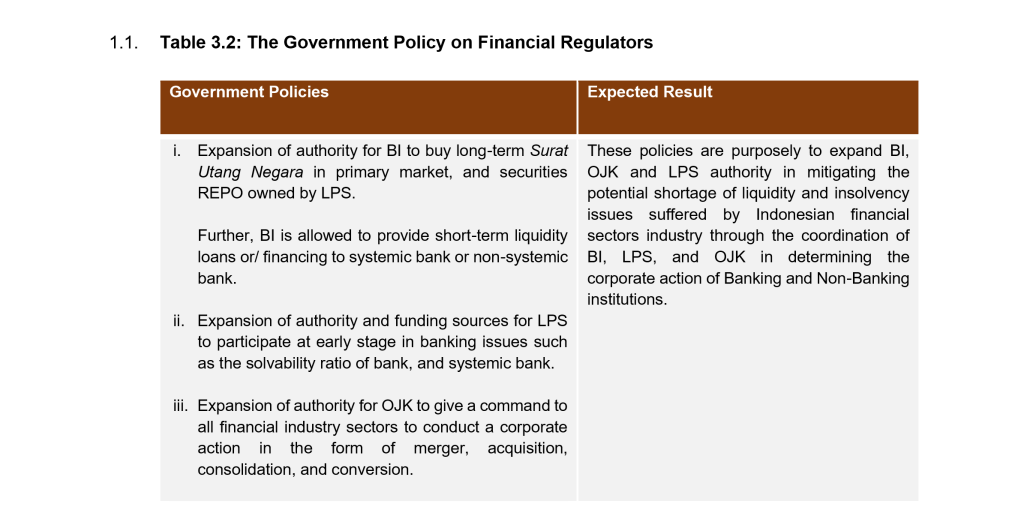 3.1. In particular, for financial sectors, the government has expanded the authority of three core financial regulators in Indonesia, the Financial Services Authority (Otoritas Jasa Keuangan “OJK”), the Bank of Indonesia (“BI”), and Deposit Insurance Agency (Lembaga Penjamin Simpanan “LPS”) (Table 3.2). In addition, both BI (Table 3.3) and OJK (Table 3.4) have also taken extraordinary measures by issuing several policies which are intended to provide economic stimulus and regulatory leniency for business actors in Indonesia during this pandemic. These policies are expected to immediately repress the damaging impact of COVID-19 towards the domestic economy.