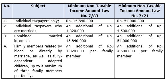In Article 2 paragraph 3 Law No. 7/21, the minimum amount of Non-Taxable Income per year has been changed, the difference can be seen in the following table:
