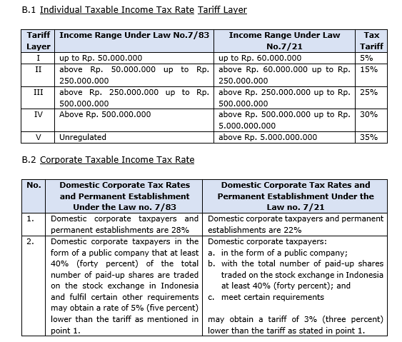 Furthermore, Law No. 7/21 also changes the rate of Taxable Income of domestic individual and corporate taxpayers, as listed in tables B.1 and B.2 below: