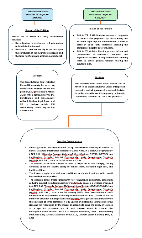 The above precedent and POJK 22/2023 highlight the importance of the good faith principle and Article 251 of KUHD for the insurer and the insured. The following charts are the brief explanations on the Constitutional Court’s decisions to the petitions which challenged the applicability of Article 251 of KUHD.