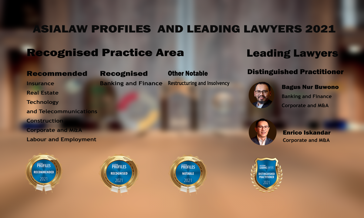Bagus Enrico & Partners has recently been ranked in Asialaw’s 25th Annual Edition publication in 8 practice areas. Our partners Bagus S D Nur Buwono and Enrico Iskandar have also been listed and recognized as Distinguished Practitioners for Corporate and M&A as well as Banking and Finance.