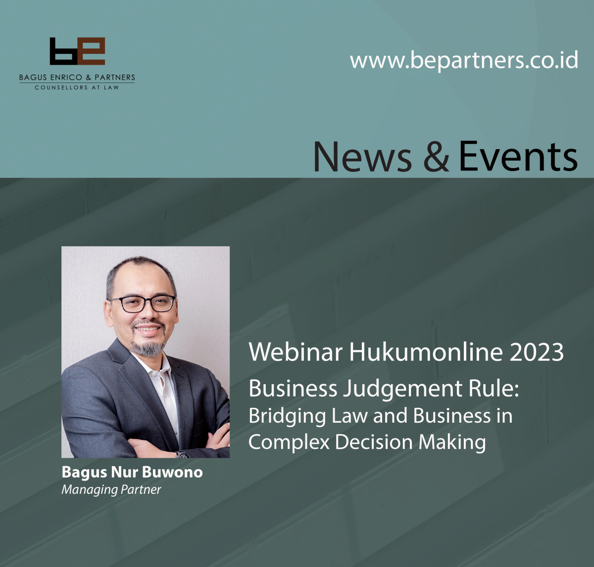 On 15 August 2023, our Bagus S D Nur Buwono, alongside with Dr. Yunus Husein, S.H., LL.M., Lecturer from Sekolah Tinggi Hukum Indonesia Jentera, has shared their knowledge and experience in the topic of Business Judgement Rule: Bridging Law and Business in Complex Decision Making, on Hukumonline.com’s recent webinar.