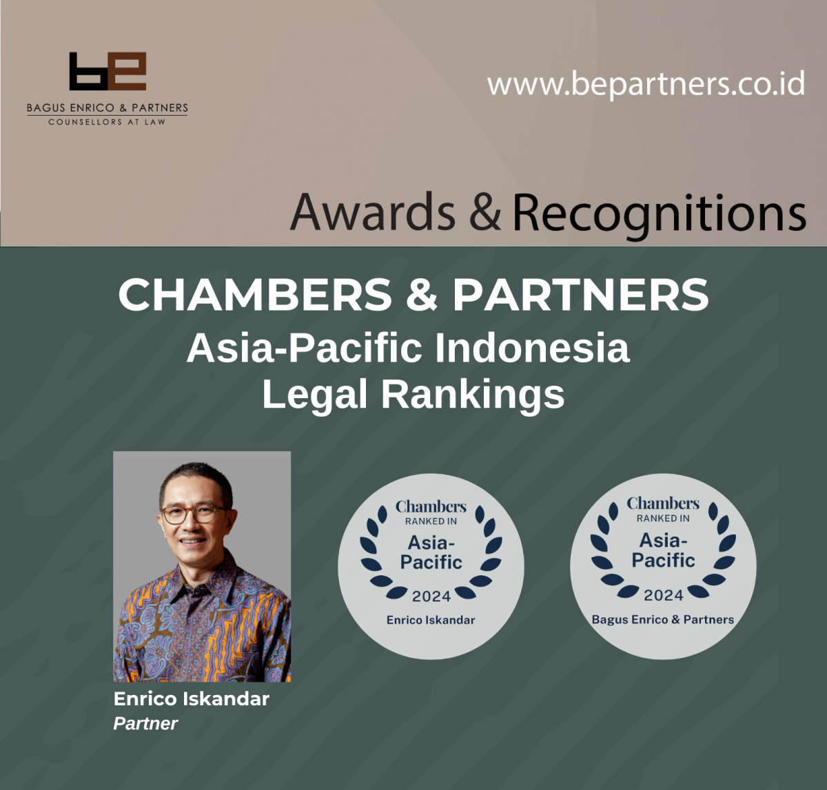 Congratulations to our Enrico Iskandar and TMT's Team for another year of being ranked in Chambers & Partners 2024 Asia-Pacific Indonesia Legal Rankings.