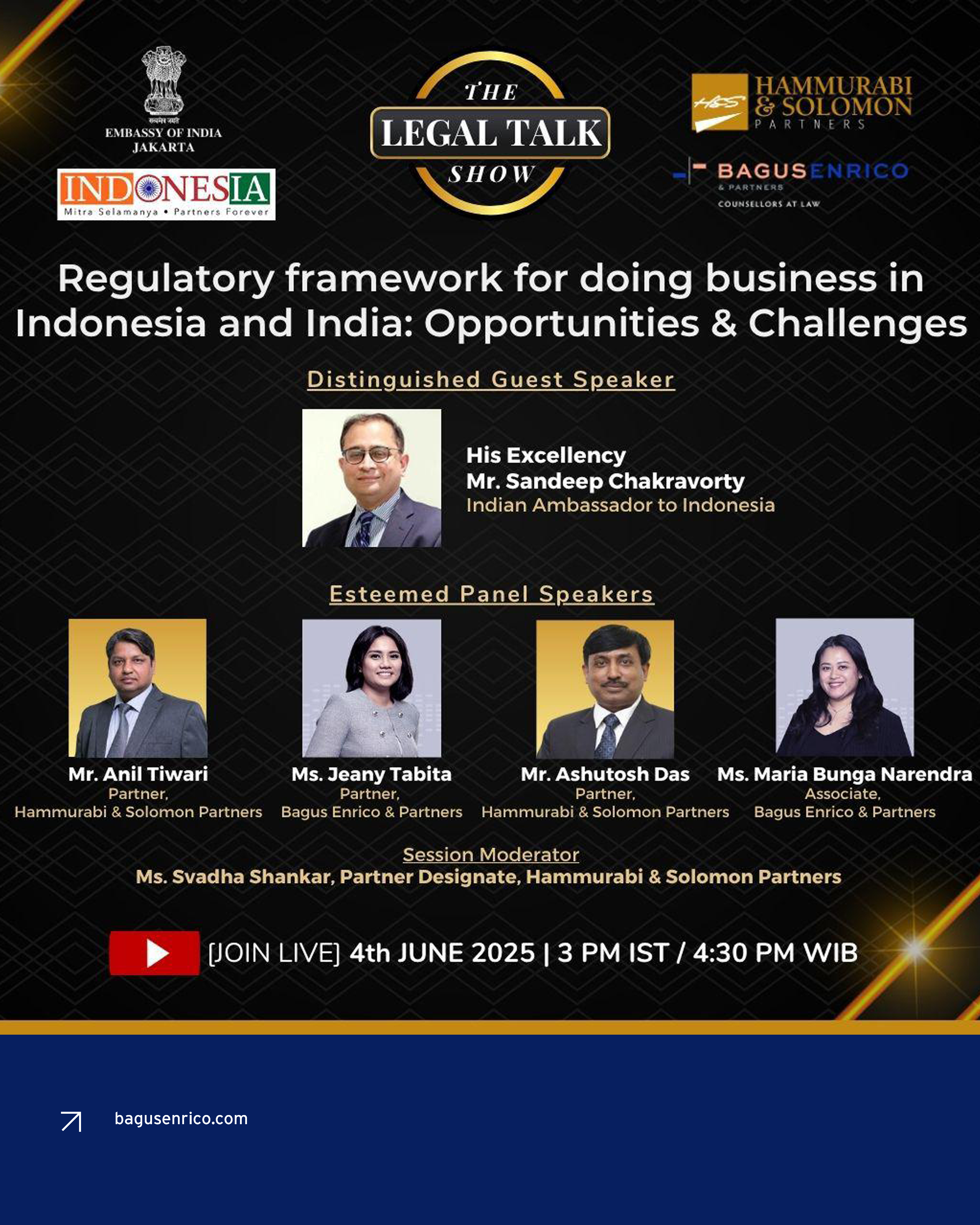 Join us for an engaging Live session on “Regulatory Framework for Doing Business in Indonesia and India: Opportunities and Challenges”, jointly hosted by Bagus Enrico & Partners and Hammurabi & Solomon Partners.